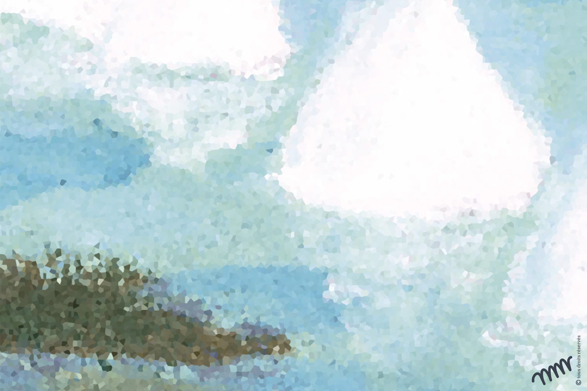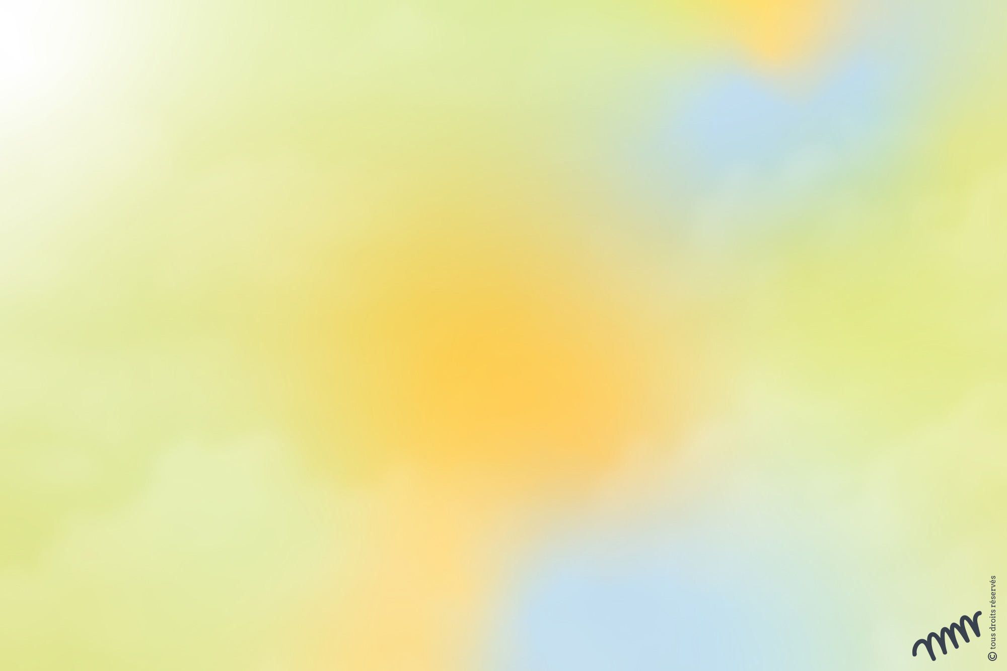 Recherches colorimétriques et prototypage pour créer un motif aérien et nuageux dans des tons de vert, orangé et bleuté. Application graphique sur l’univers en dégradé aérien avec des éléments nuageux estompés.