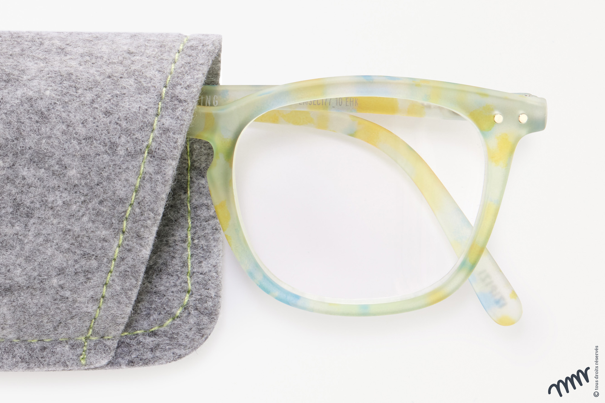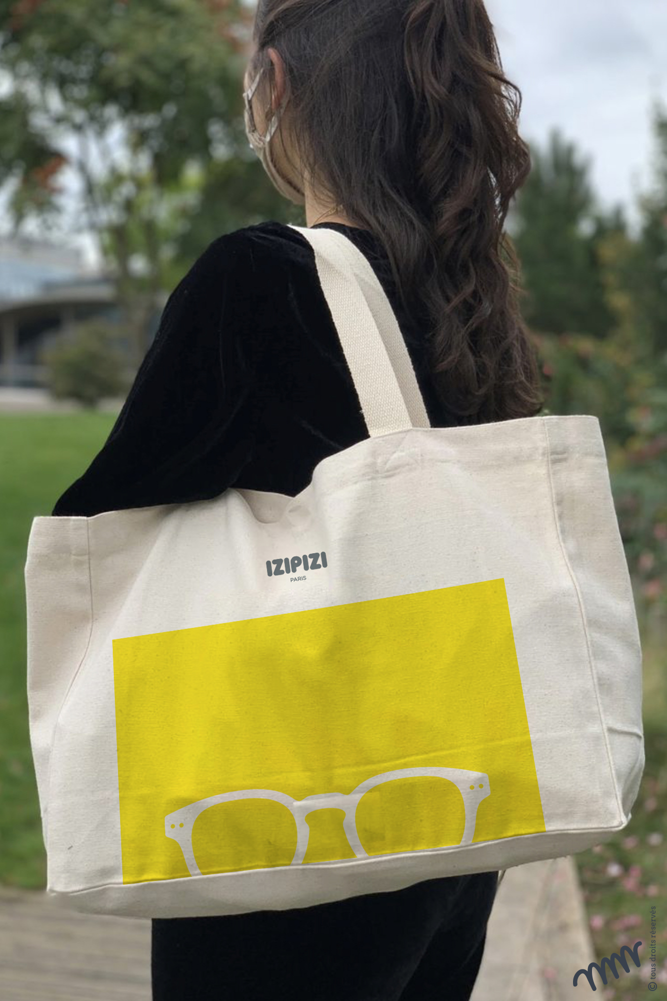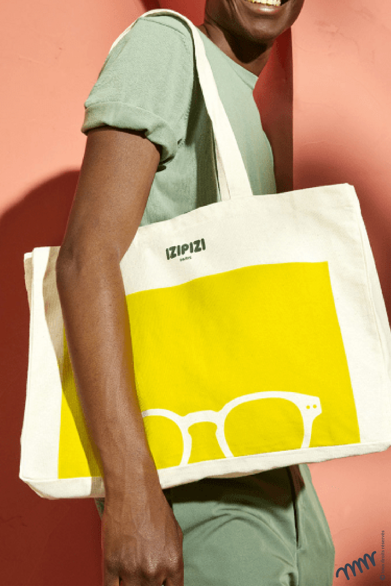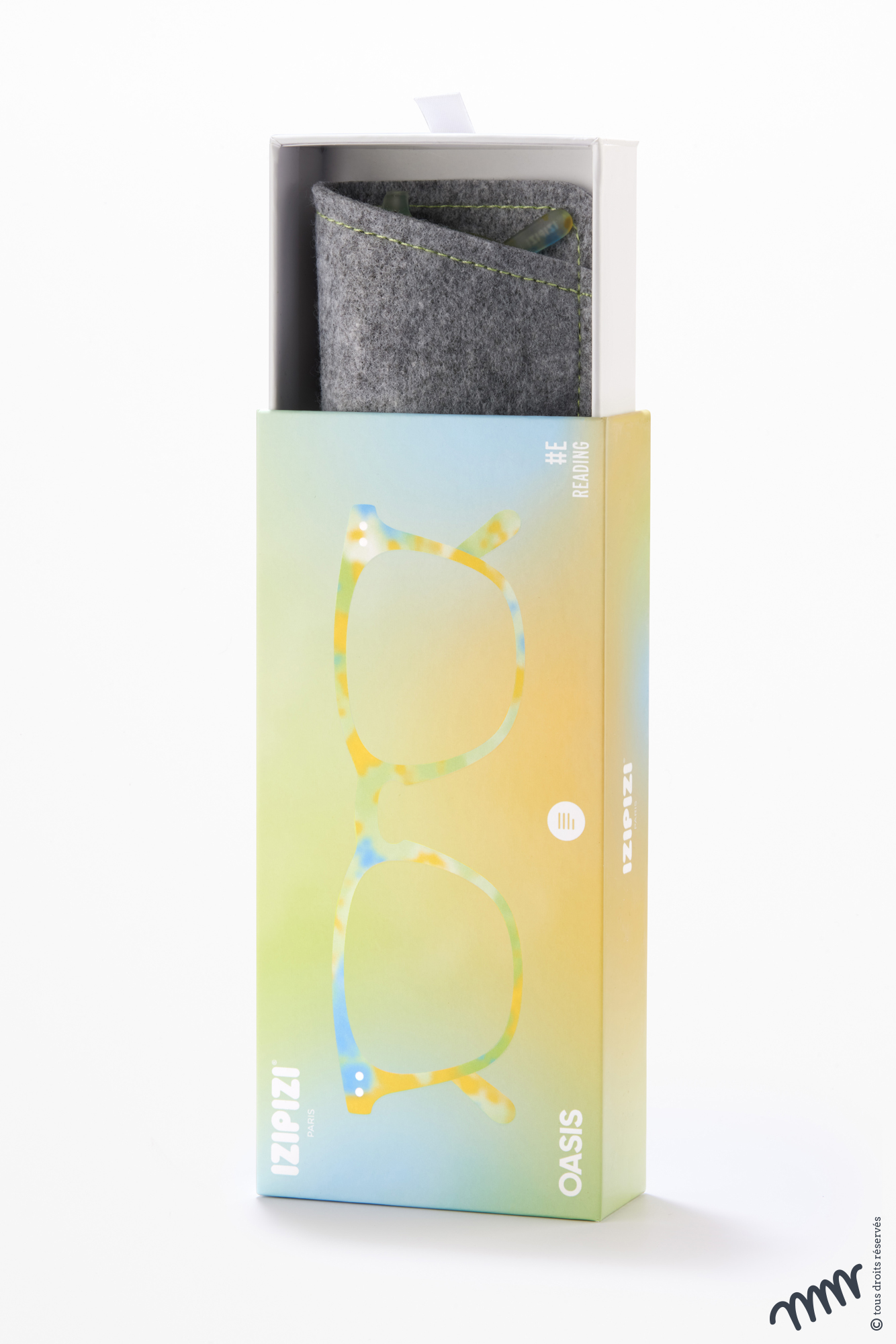 Motif aquarellé dans un esprit léger et estival de vacances à la plage autour des coloris du produit principal (lunette), appliqué sur une foutah et coordonné sur un tote bag et le packaging des lunettes.