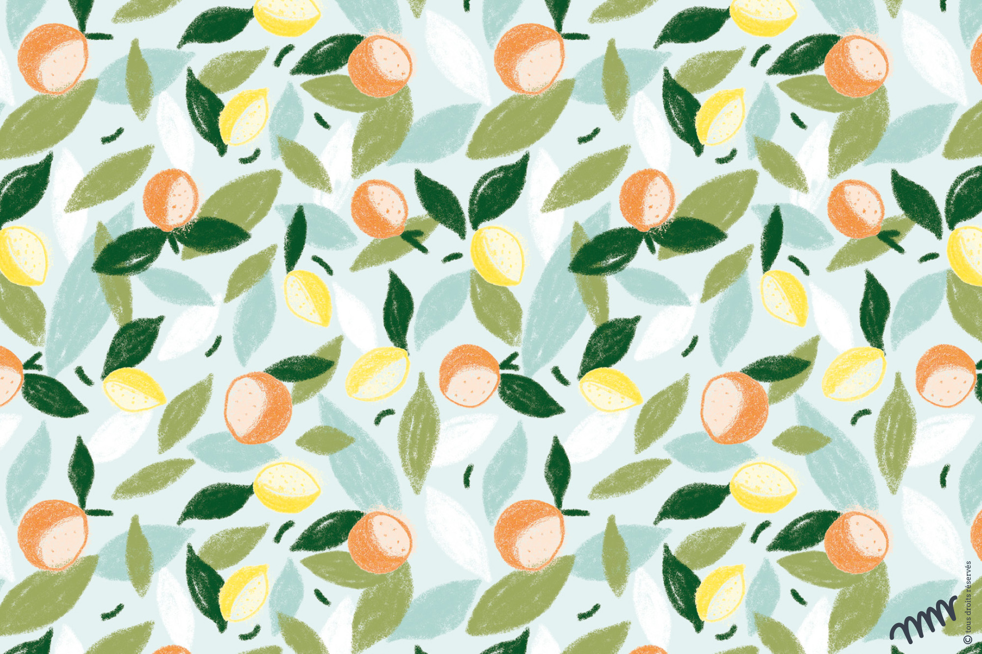 Collection de motif estivale illustrée autour des agrumes et de leur feuillage. Se décline en plusieurs coloris.