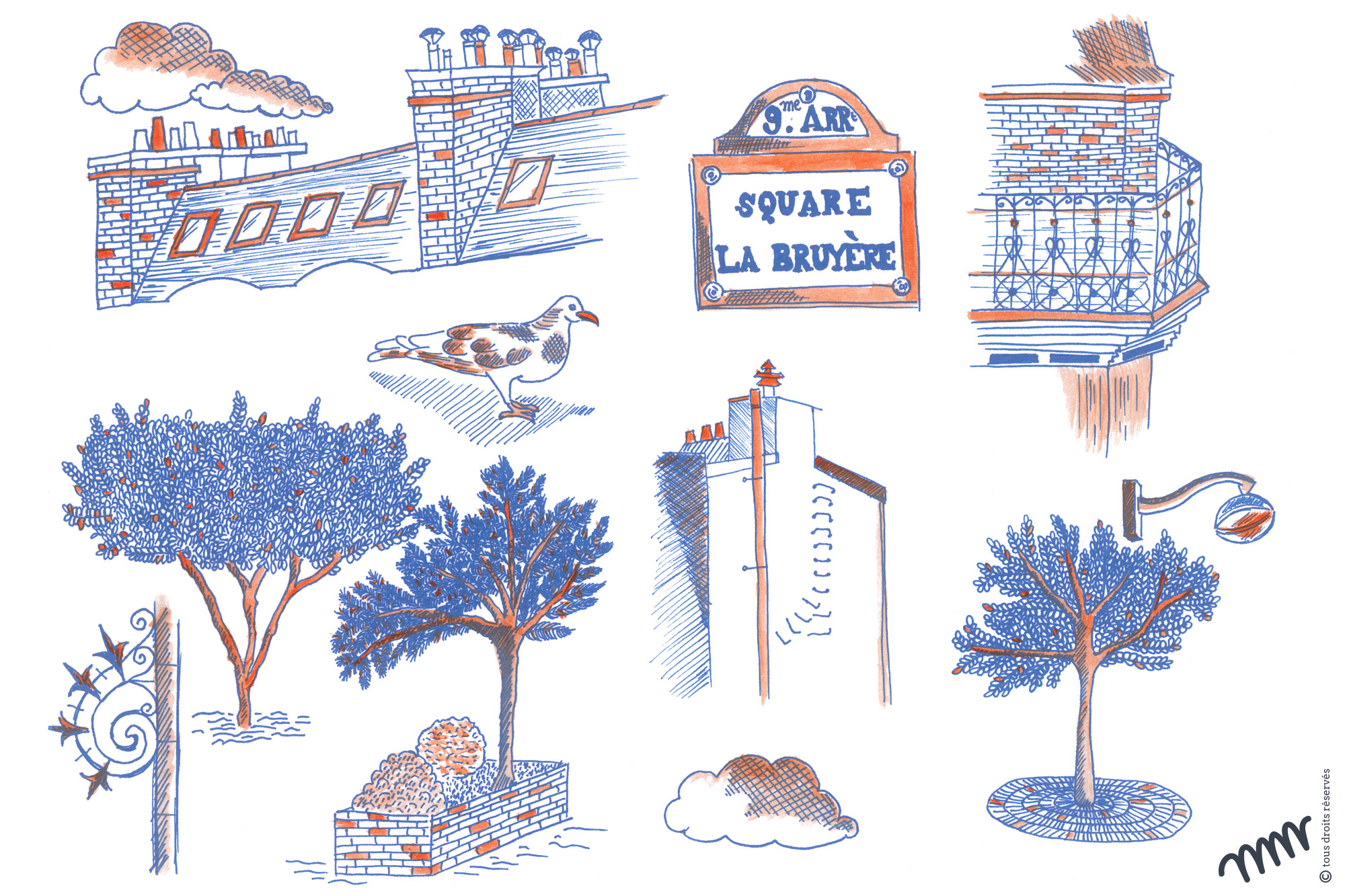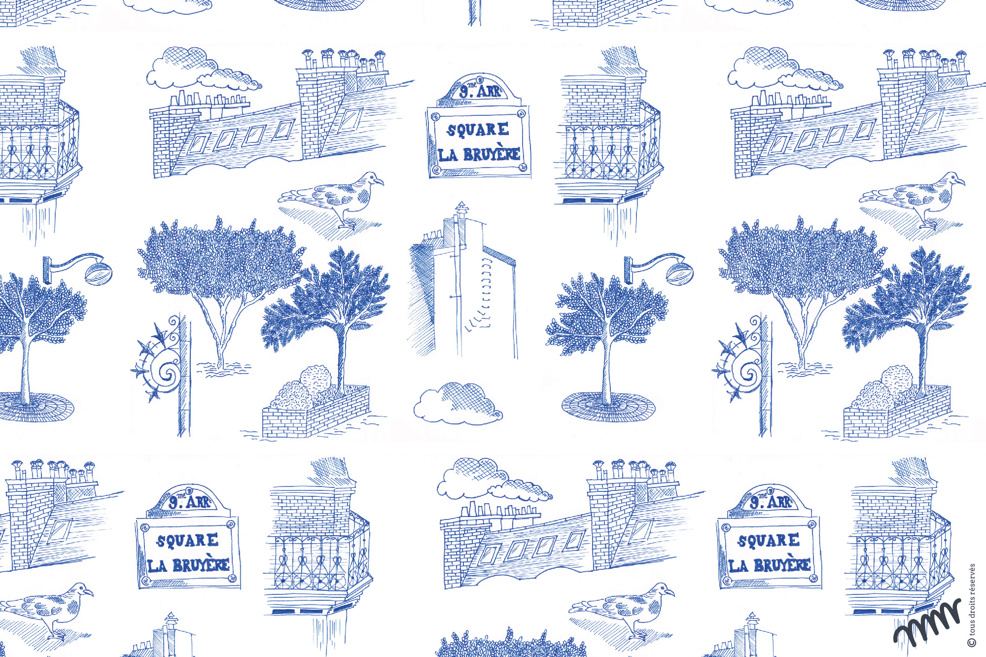 Bâtiments parisiens illustrés dans un esprit toile de Jouy modernisée.